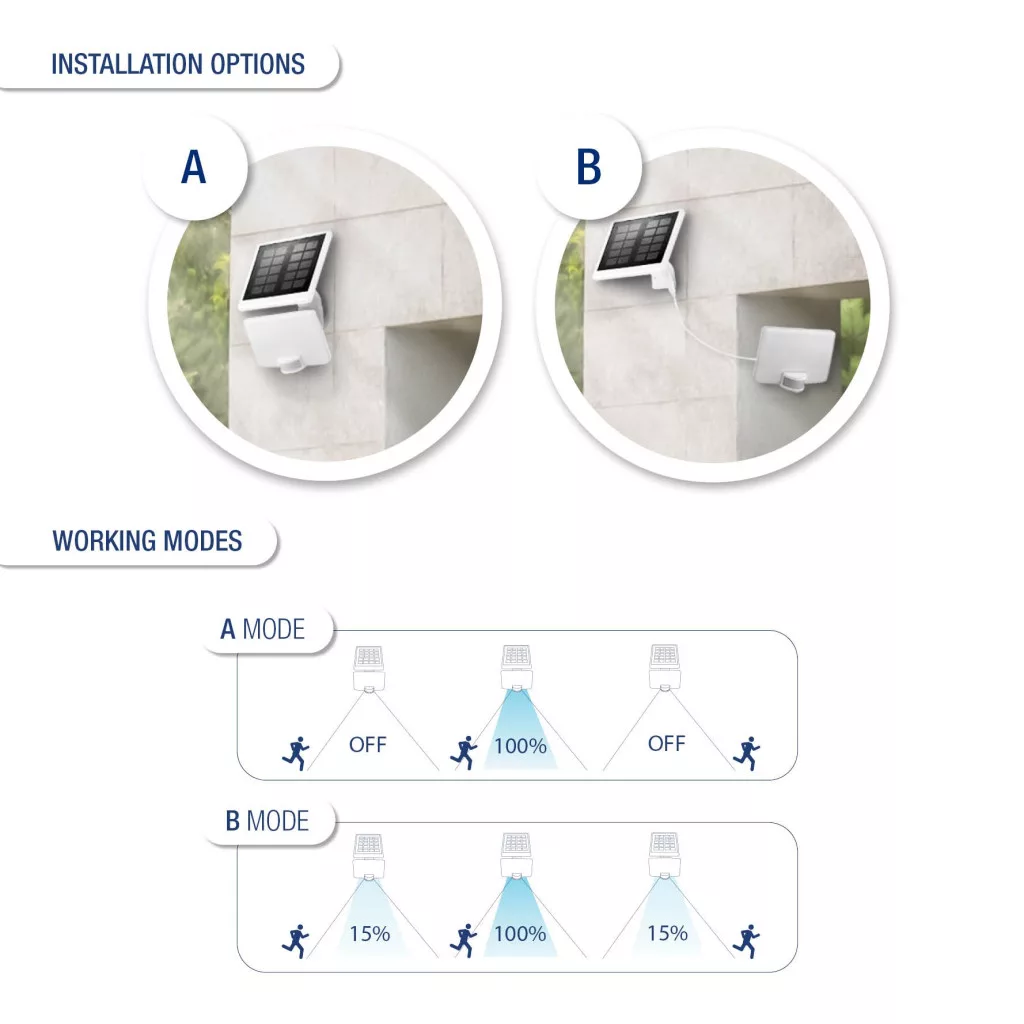 Erőteljes kültéri LED reflektor, mely kiválóan alkalmas kertek, udvarok, bejárók vagy garázsbejárók energiatakarékos megvilágítására. A különálló napelem és a beépített mozgás- és fényérzékelő automatikus és hatékony működést biztosít, anélkül hogy vezetékekre vagy hálózatra lenne szükség.